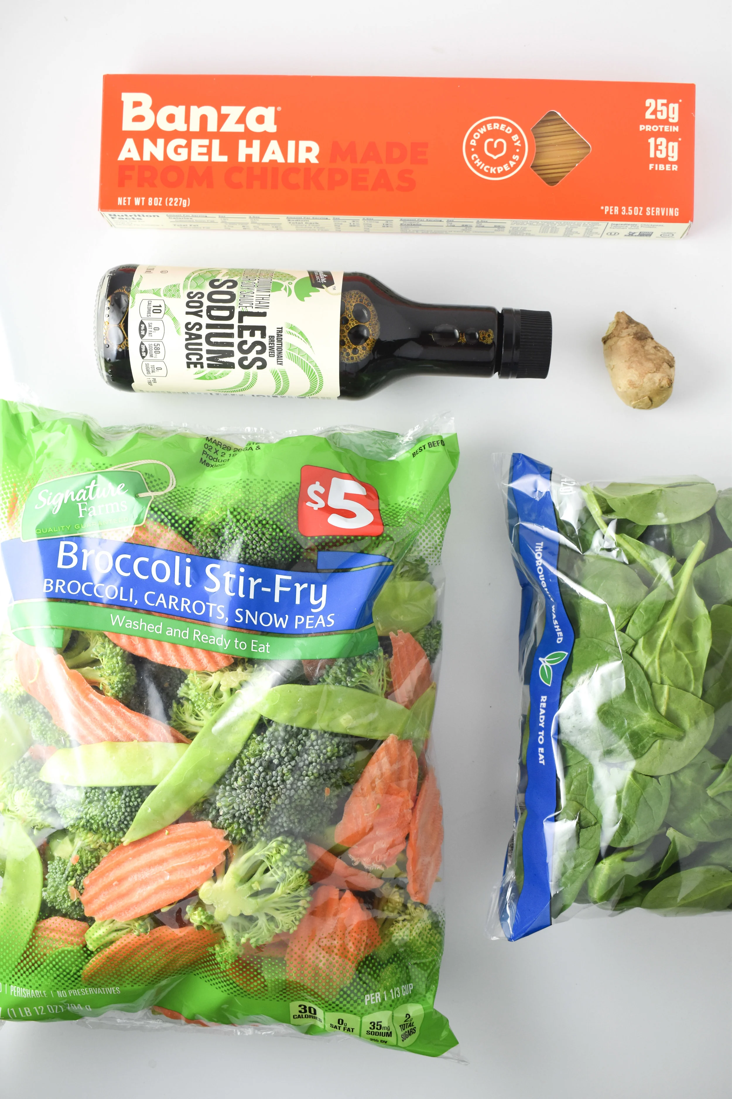 /I get this growing feeling of anxiety in my stomach when I’m leaving work and I know I don’t have any food at home to eat. That’s the kind of mood I was in on Monday night - THEN I saw this recipe from Damn Delicious on Pinterest. I hopped in my car and bought just 4 items - a bag of broccoli stir-fry ($5), 2 boxes of this pasta ($5), a tiny knob of fresh ginger ($0.12) and a bag of fresh spinach ($3.50). The great thing is - I only used half of the veggies, which means I can prep and freeze them for the next time I want to make this recipe! That’s just $1.50 to $1.88 per meal for 8-10 meals, which is an incredible bargain for me. To be totally transparent, I did already have most of the sauce ingredients on hand already (soy sauce, honey - these are staples at my house)!